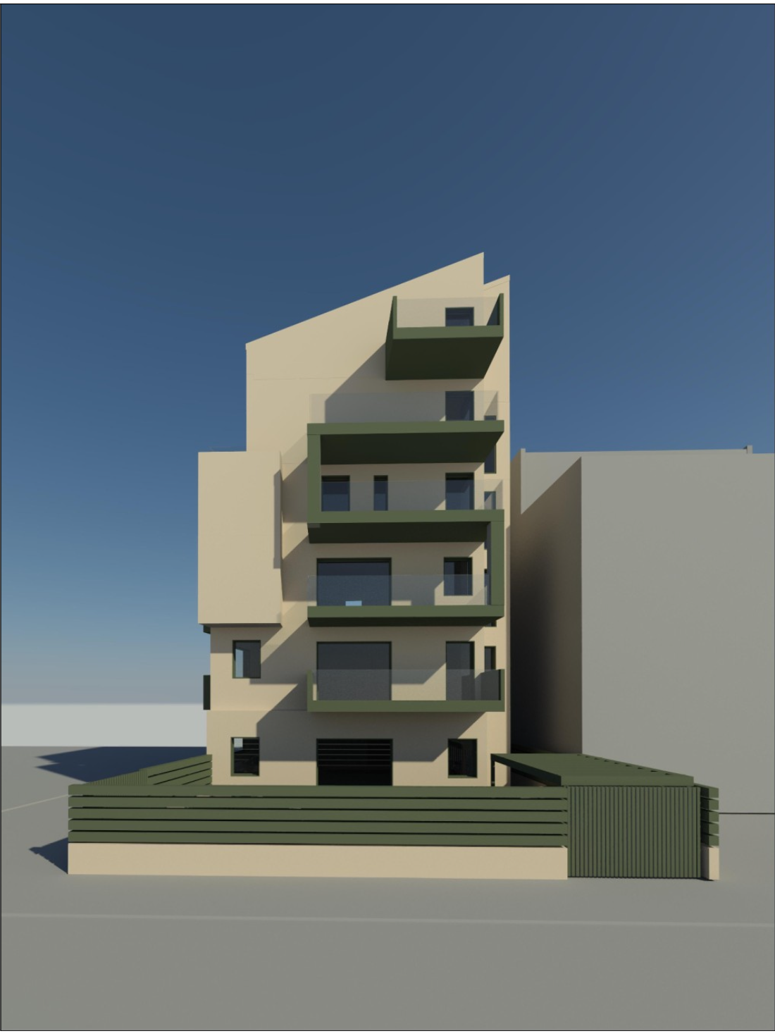 Architectural Concept: A modern 4-story building plus an attic level.